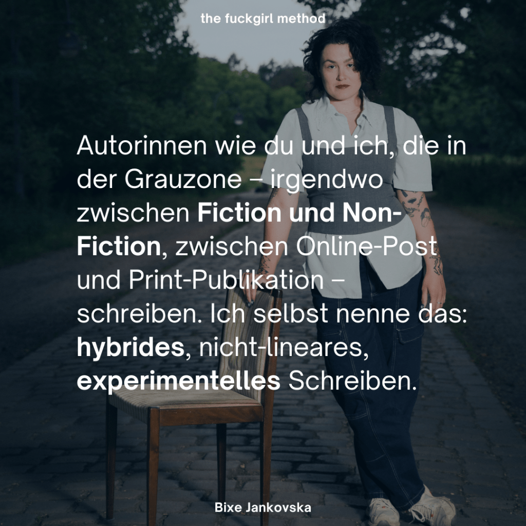 Die „fuckgirl method“ macht nicht nur Bock, sie ist auch alles andere als traditionell. Und genau dieses Vorgehen möchte ich als Case-Study mit euch durchgehen. Egal, ob dein Projekt am Ende fiktional, nicht-fiktional, auto-fiktional oder irgendetwas dazwischen sein soll.
